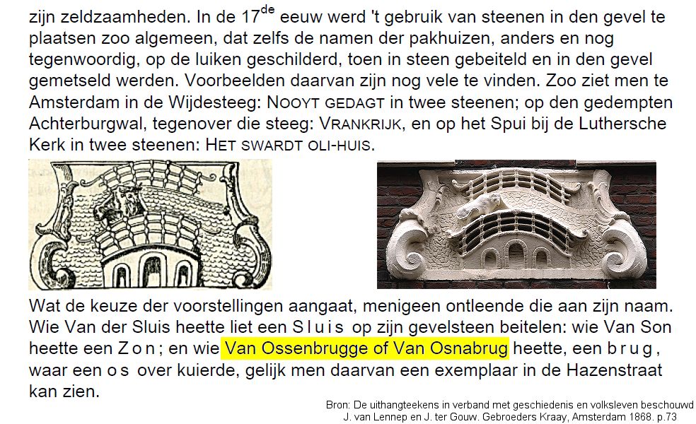 View a more creative "van Osnabrug" sign under the image on the left. It is a wall plaque at Hazestraat 62 in Amsterdam depicting an "Ox-after-bridge" (Os-na-brug). |