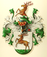 The shield depicts (in silver) a jumping stag of natural color on grass. The crest shows the stag's head and neck emerging from the helmet.