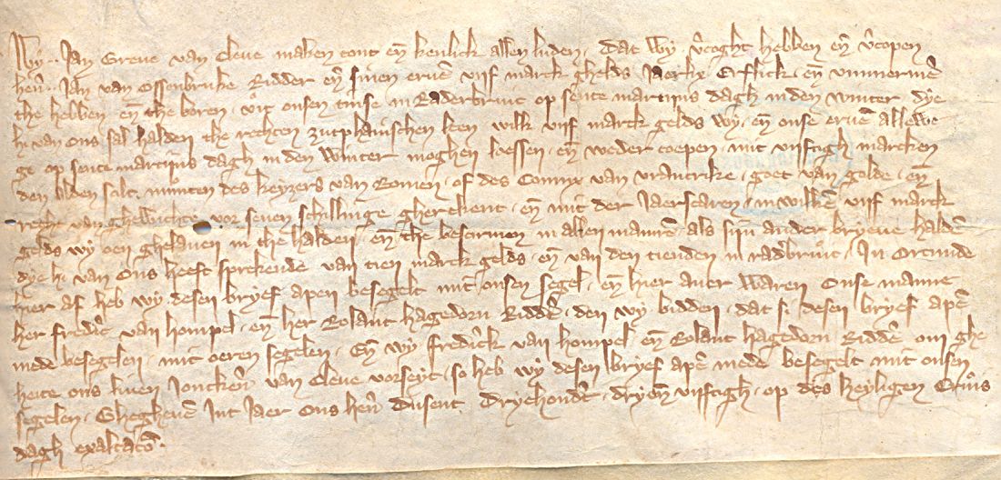 Part of the bride's dowry is: 7 Holland's morgen land "schietende mit eyner zyden an lande voirtytz Hacken no ons gnedigen heren ind voirt mit der andere zyden ind eynden an die gemeyne straete der erfgenamen dess wards". Further another 4 Holland's morgen land named The Kyffwart, "mit eynre zyden langs der kalflaicke mit der andere zyden ind eynen an erfnisse Sanders van den Eger ind Gerits van Till, jairlix tien Arnoldus arnhemsche golden gulden"; Annually 7 bushel barley from 6 Holland's Morgen, named der Steenaker, "gelegen an erfnisse onss gnedigen heren ind Wolter Smullinx" etc. etc.