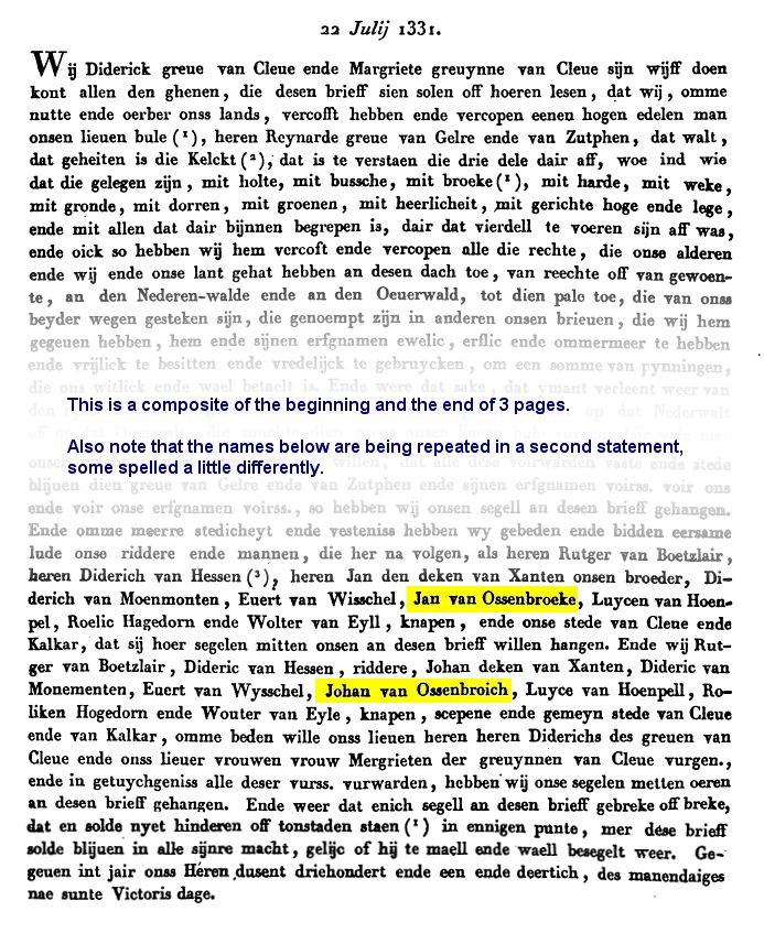 In 1331 Count Diderick van Cleves announces to have sold lands and woods to Lord Reynard Count of Cleves and Gelre. Supported by the Noblemen of Cleves, including Jan van Ossenbroeke. |