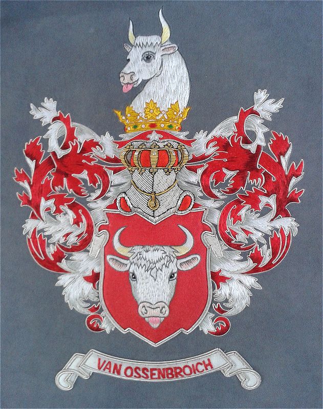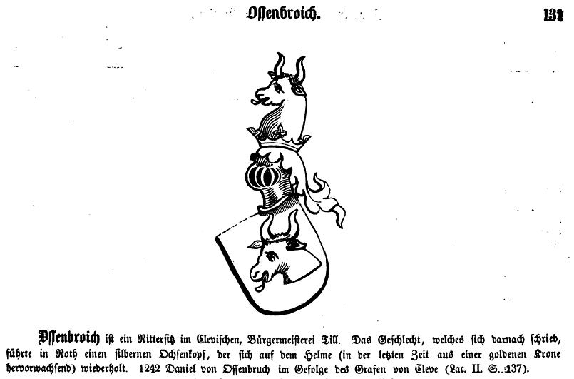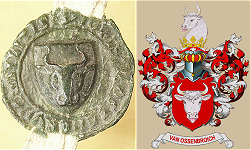 The described family carried -in red- a silver ox head, which was repeated on the helmet (in later times ascending from a golden crown). In 1242 Daniel de Ossenbroich (or von Ossenbruch) was in the Count of Cleves' entourage. Click on the above gray arrow for next slide.